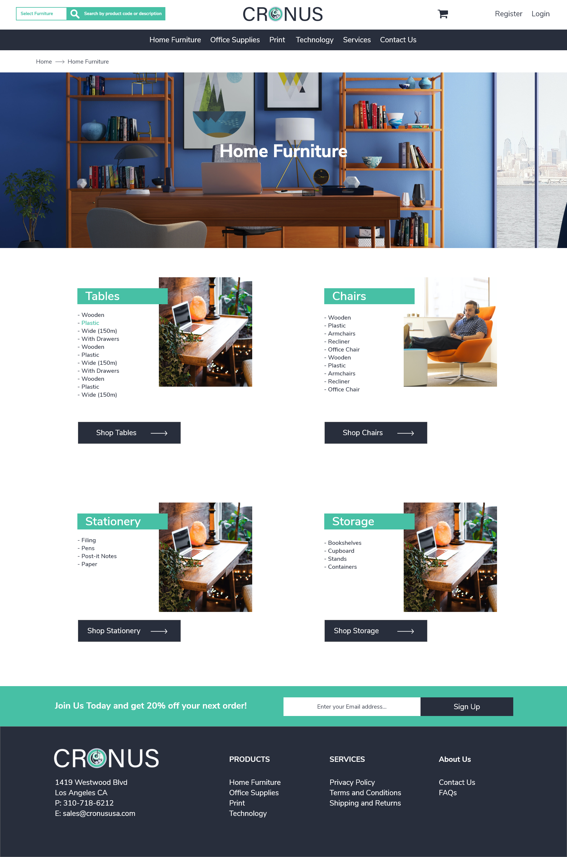 The Fronus/Cronus site was to a furniture based webstore due to the sample products in the Microsoft Business Central being office furniture products. I conducted research into other furniture sites to get a sense of the aesthetic and content layout on which i could base the Fronus site on. A lot of furniture webstores have a pattern of splitting content on the home page into 2 vertical sections. This is what inspired me to create an asymmetrical aesthetic which not only allows featured content to stand out, but it also brings a fresh and unique appearance to the webstore. I also decided to do a text overlay on the images which mimics the flyer layout and design where text is often placed over the top of the image.